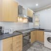Cuisine avec cuisinière à gaz, four électrique, micro-ondes, lave-vaisselle, réfrigérateur-congélateur, machine à café, bouilloire électrique et grille-pain