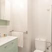 Salle de bain en-suite avec lavabo simple, douche et toilettes