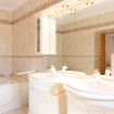 salle de bains avec double lavabo, baignoire/douche, bidet et toilettes