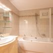 salle de bains attenante avec double lavabo, baignoire/douche, bidet, toilettes et sèche-cheveux