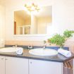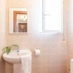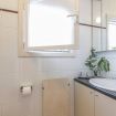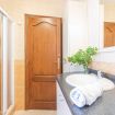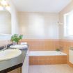 badkamer met dubbele wastafel, bad, douche, bidet, toilet en föhn