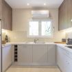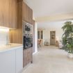 keuken met electrisch fornuis, electrische oven, magnetron, afwasmachine, koel-vriescombinatie, koffiezetapparaat, waterkoker, broodrooster en citruspers
