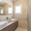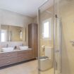 badkamer met dubbele wastafel, bad, douche, bidet, toilet en föhn