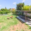 Jardín con césped, árboles y mobiliario de jardín con tumbonas