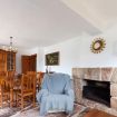 Un área de estar de concepto abierto tiene una sensación clásica mediterránea, con frescos suelos de baldosas, asientos cómodos y un televisor con cable para mañanas tranquilas alrededor de la villa.