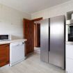 Cocina con cocina de gas, horno eléctrico, microondas, lavavajillas, refrigerador, congelador, cafetera, hervidor eléctrico, tostadora y exprimidor